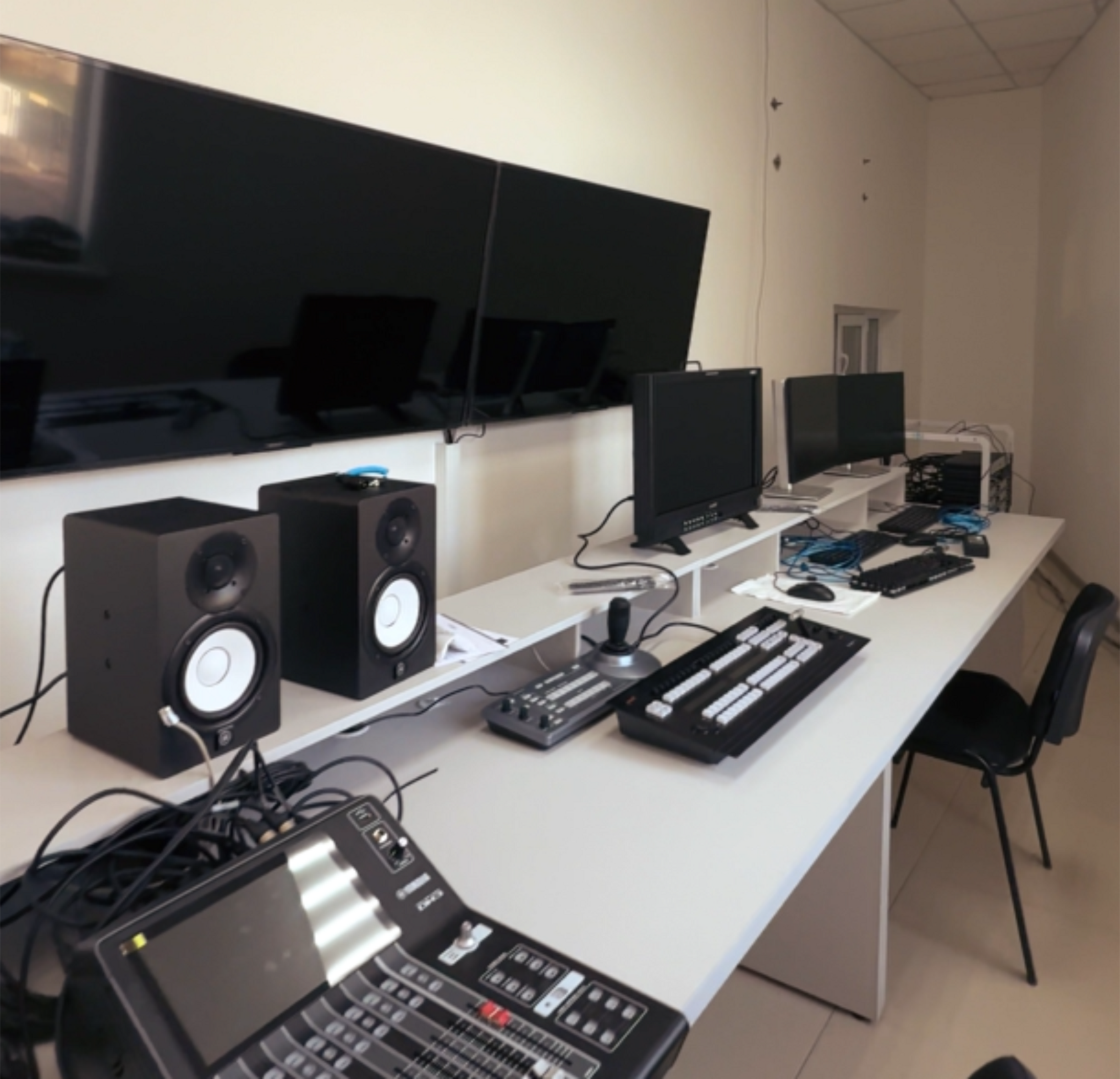 The studio’s audio system is built around a digital mixing console, wireless microphone systems for presenters and guests, and monitoring systems in both the control room and the studio. Separate channels are provided for broadcast audio, communication with the control room, and backup lines. The acoustic design and audio routing were developed to ensure clear speech and stable microphone operation without feedback, even under typical television studio conditions.