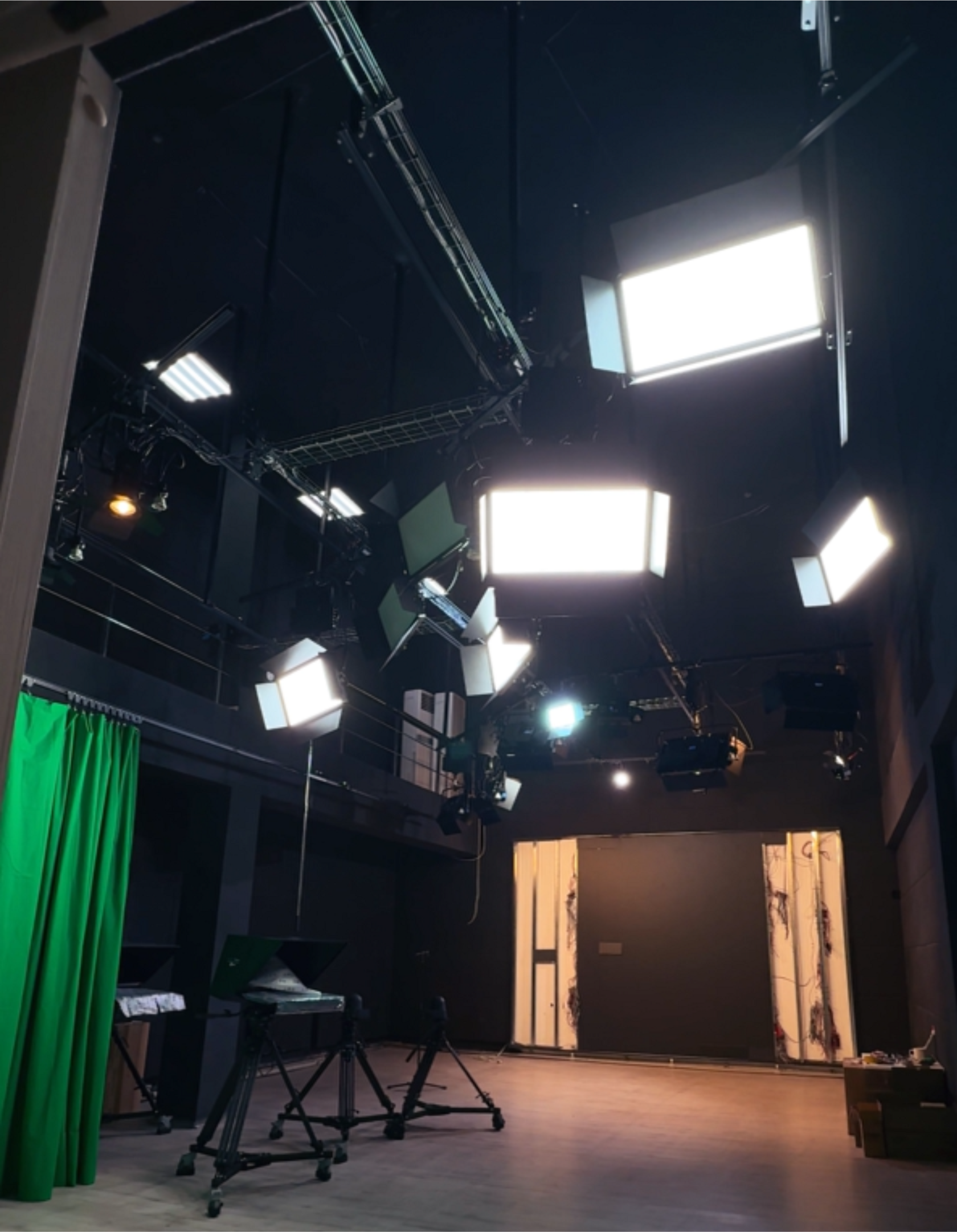A modern lighting system was designed and implemented for the news studio using LED fixtures: key, fill, and backlight, as well as accent lighting for presenters’ zones and decorative set elements. The suspension and cabling system was carefully planned to provide easy access to the fixtures and flexibility for future set reconfigurations. Lighting control is implemented through a lighting console and DMX infrastructure, allowing rapid switching of lighting scenes for various broadcast formats, including news, interviews, and special projects.